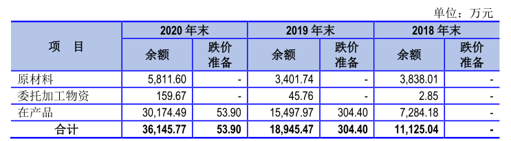 值得注意的是,欣巴科技目前存货跌价准备计提标准似乎存在一定不合理之处。如上图所示,2018年,公司在产品余额为7,284.18万元,公司未进行计提跌价准备;2019年,公司在产品余额为15,497.97万元,公司计提跌价准备304.40 万元;到了2020年,公司在产品余额增长至30,174.49万元,但公司所计提跌价准备反而下降至53.90万元。