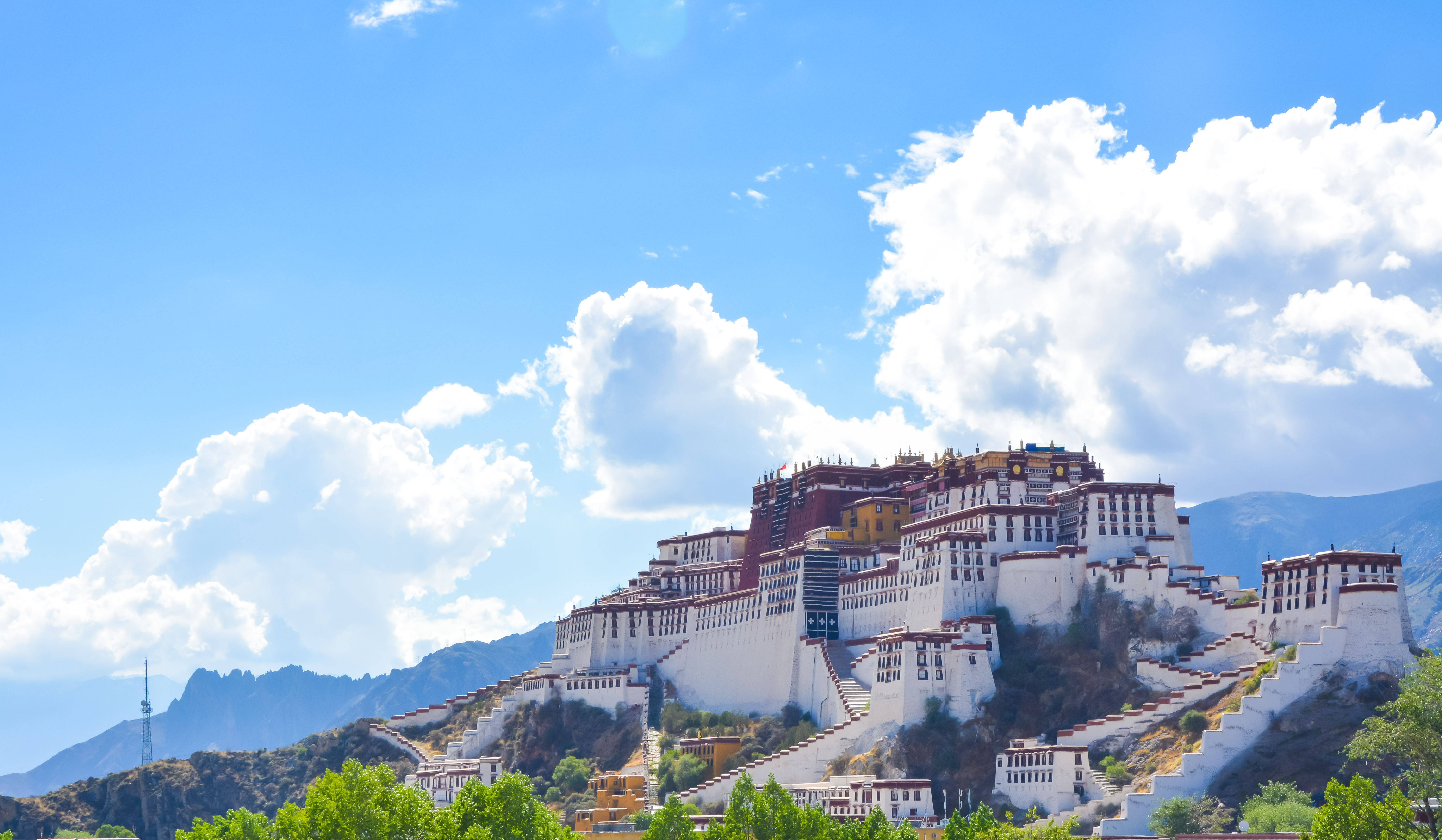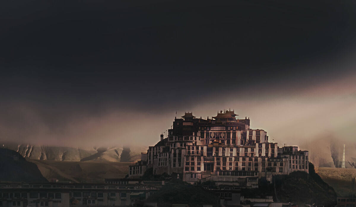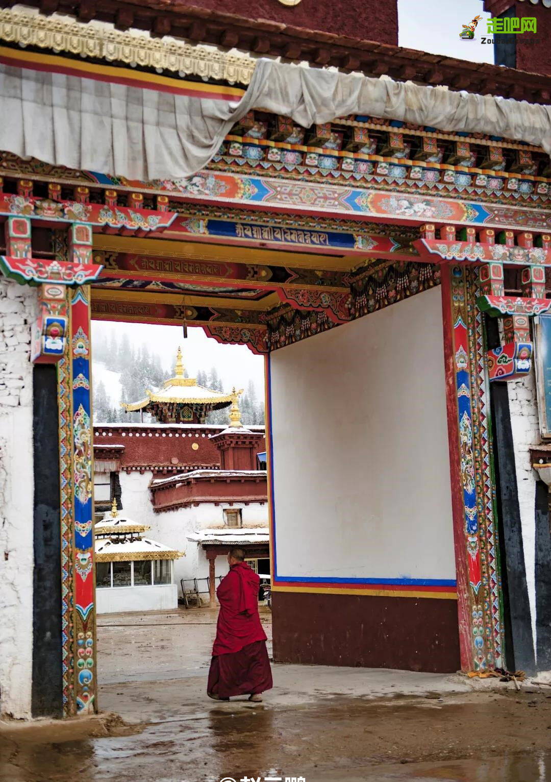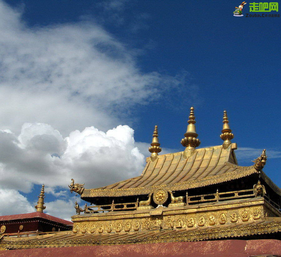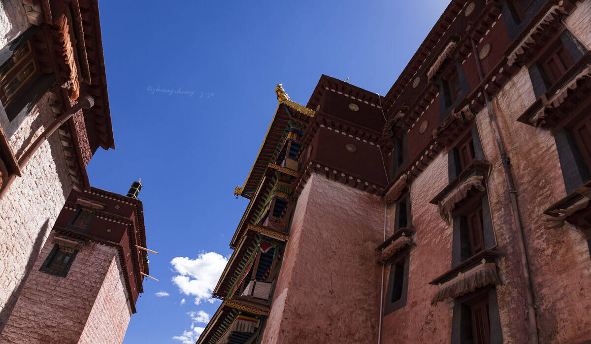 这座庄严肃穆的宫殿式建筑群,傲然挺立在山巅之上,赭红的宫殿掩映在雪白的宫墙中,闪耀着神圣的金光。