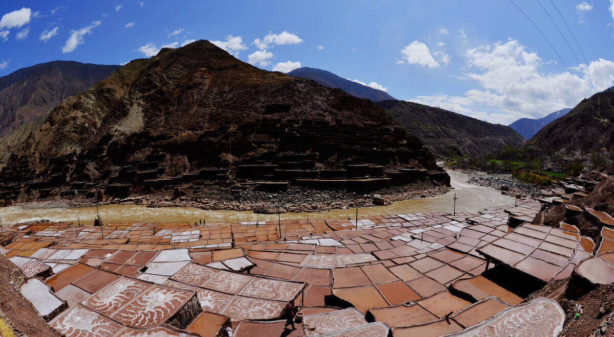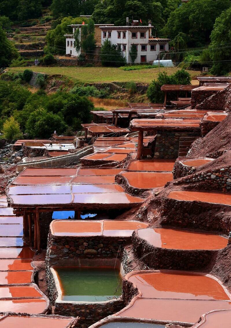 从高空中俯瞰,大小不一的浅浅石槽,错落有致地分布在盐田周围,犹如一方方砚台比肩伫立,蔚为壮观。