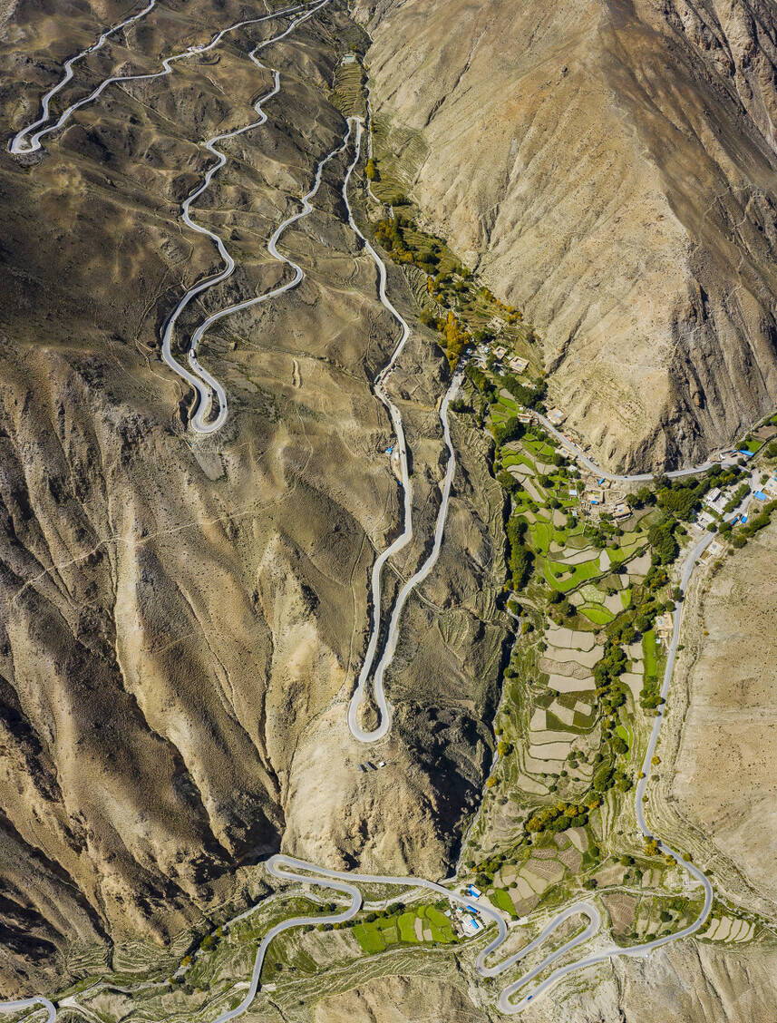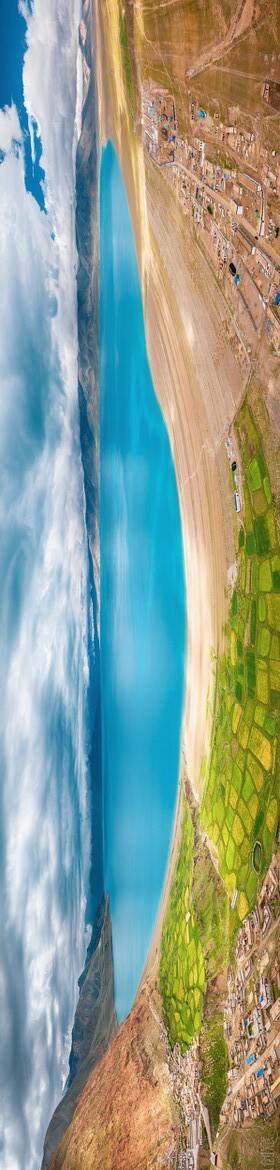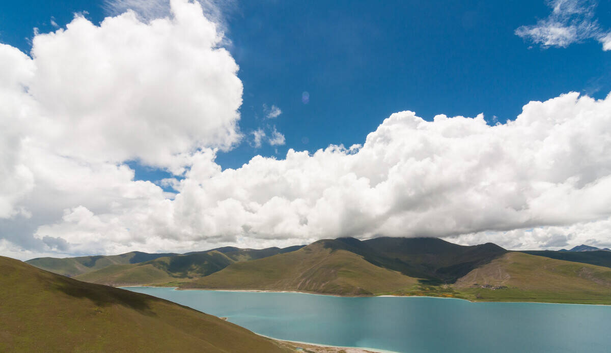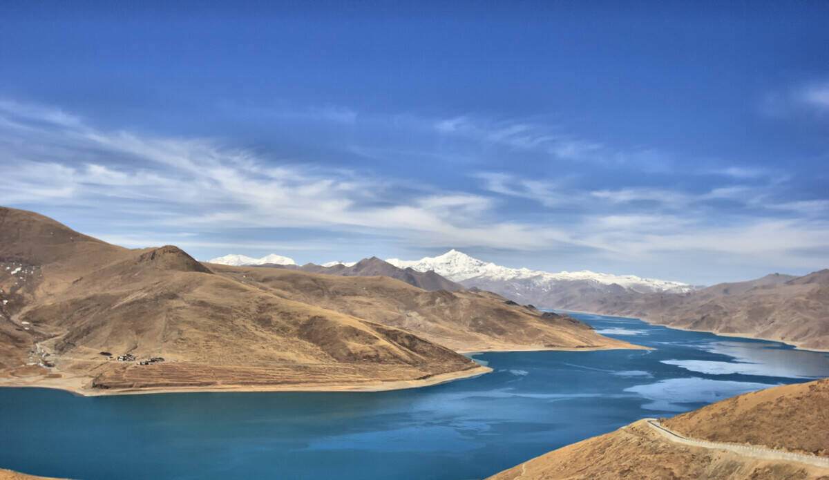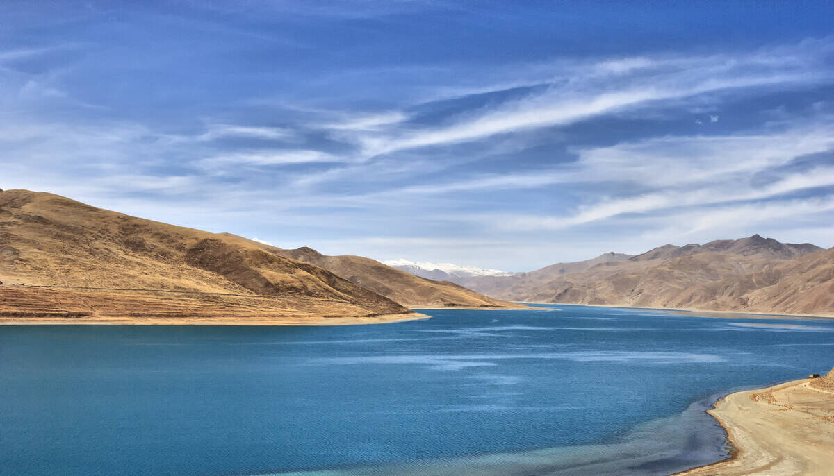 从高空中俯瞰,羊卓雍措犹如耳坠镶嵌在山的耳轮之上,故其在藏人心中被看作“神女散落的绿松石耳坠”。