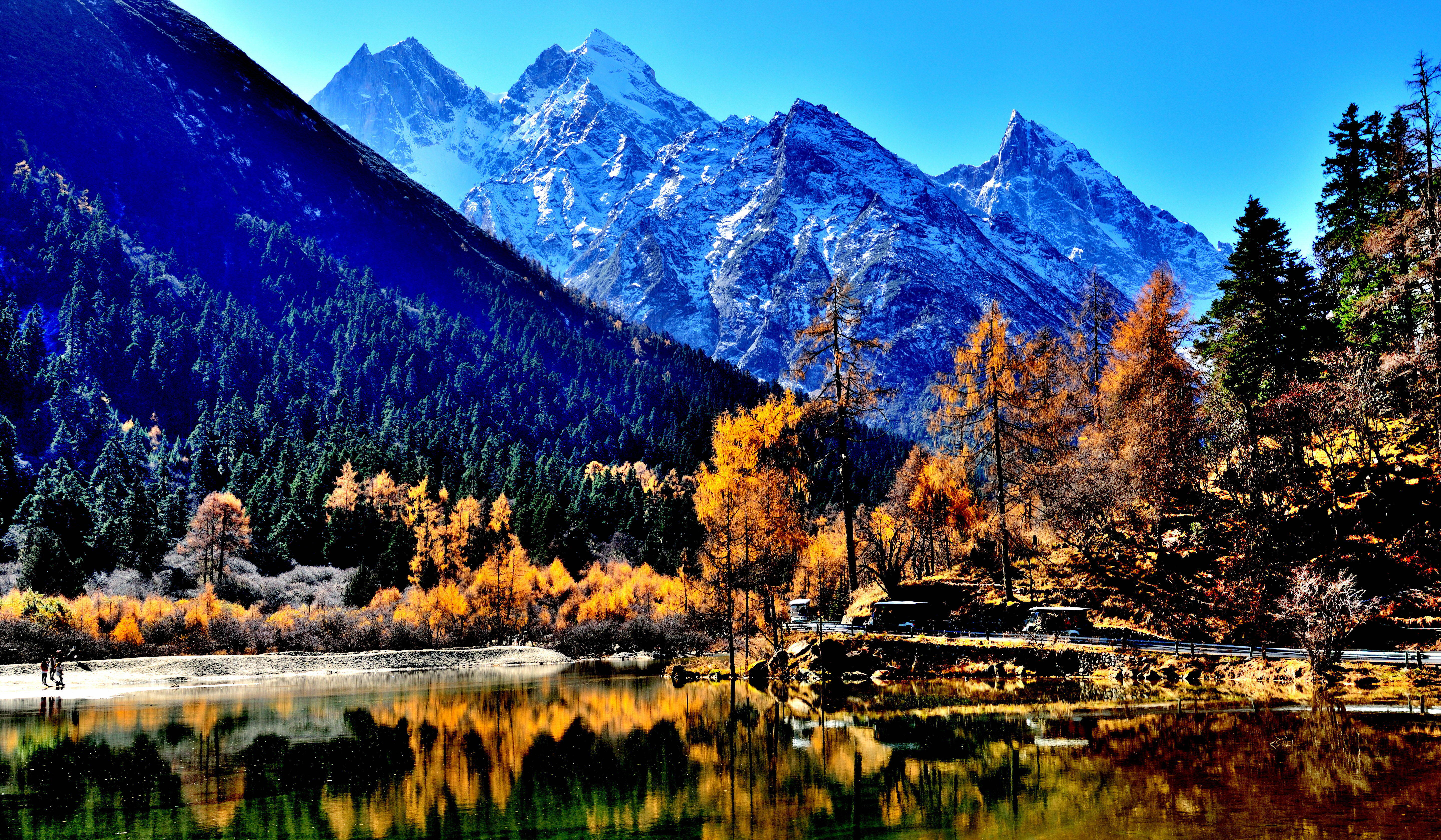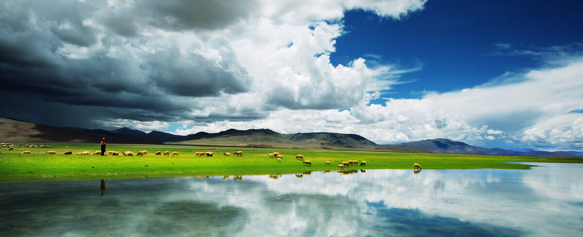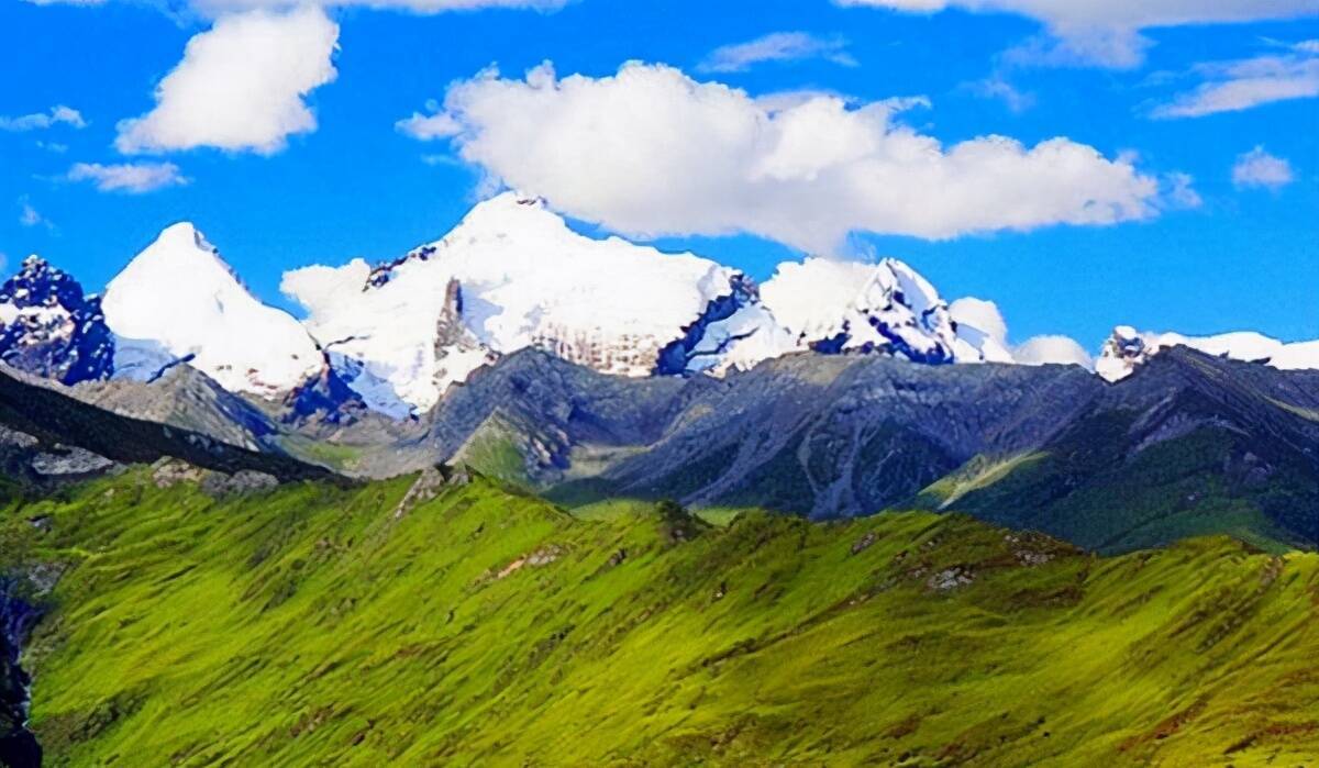 碧草如茵的草甸,和着碧蓝的湖水、白雪皑皑的雪峰,景色如诗如画。