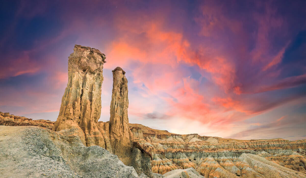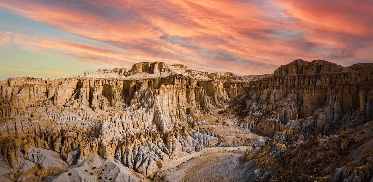 夕阳西下时,漫天的彩霞照耀在土林上,那极致的荒凉,恍若闯入一个未知的外星球。