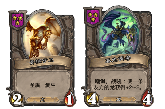 青铜守卫加暮光使者应该是前期战斗力最强的组合了,被BUFF过后的青铜守卫,至少能保证阿凯连升两个回合的酒馆等级。到了4级酒馆之后,又可以通过三连去寻找拉佐格尔,最后跟着节奏去寻找卡雷苟斯,刷新身材就能轻松吃鸡。