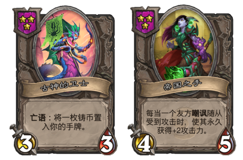 古神的卫士加帝国之手是一套更全能的打法,古神的卫士每个回合可以提供一枚铸币。刚好可以弥补必要时刻差一枚钱的尴尬。帝国之手说是目前3本随从的天花板也不为过,在给随从架上嘲讽之后,能有效的提升其作战能力。甚至中后期还可以给炎魔副官这类血量成长速度极快的随从增加攻击力,提高整体的作战能力。