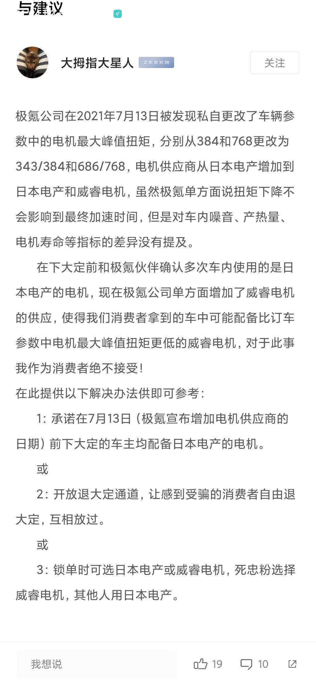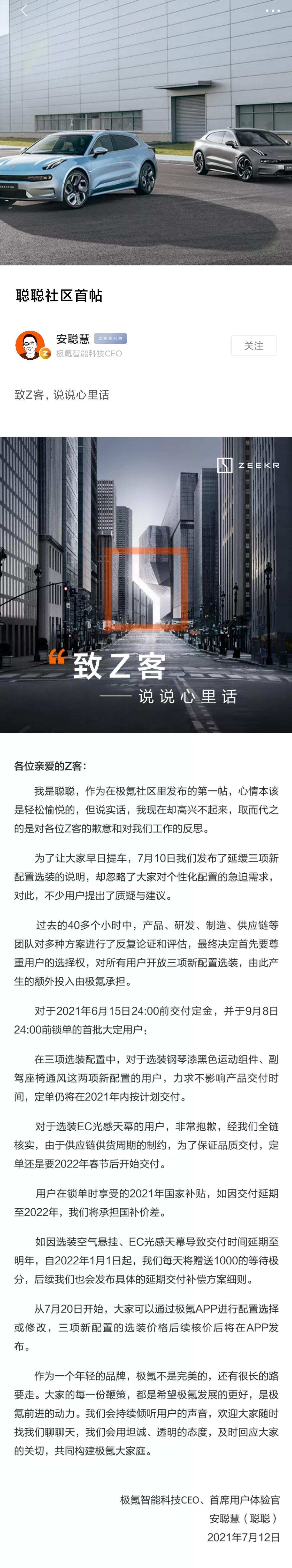 针对以上各种情况,极氪CEO安聪慧于7月112日在极氪官方App上发帖回应。