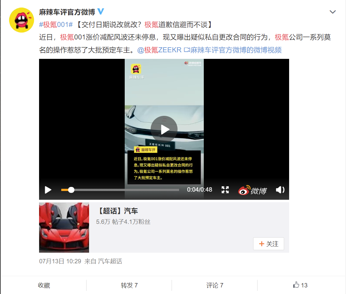 不仅如此,此道歉贴也并未就一些关键问题进行回应,某微博百万粉大V也发帖,“交付日期说改就改?极氪道歉信避而不谈”。