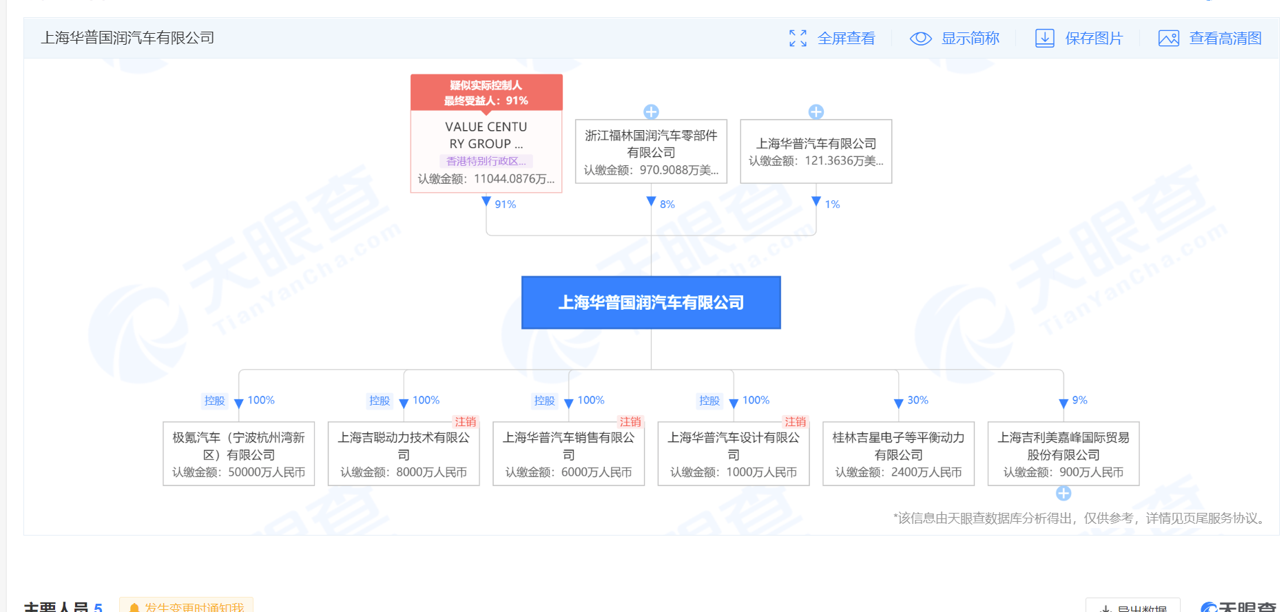 其中,VALUE CENTURY GROUP LIMITED持有宁波吉利汽车实业有限公司100%的股权以及上海华普国润汽车有限公司91%股权。