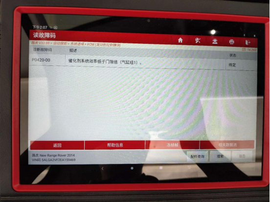 OBD接口读取故障码P0420,催化剂系统效率低于门限值,应该是三元催化器故障导致。