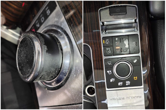 但是看到路虎特色的旋钮式换挡杆这里,我们可以看见表面的类肤涂层有明显的脱落。这算是路虎内饰的通病,涂层脱落后手感会发粘。除了换挡杆以外,全车还有不少按键也使用了这种涂层,这也是路虎内饰常被诟病的地方。