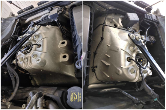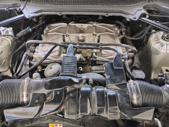 打开机盖,我们可以看到机舱整体还是比较干爽的,没有明显的油液渗漏和水泡火烧痕迹。这款路虎揽胜搭载一台代号为306PS的3.0升V6涡轮增压发动机,最大马力340匹,可以说是动力澎湃了。在配合全时四驱系统和8速手自一体变速箱,毫不夸张的说,完全能够应付各种路况。