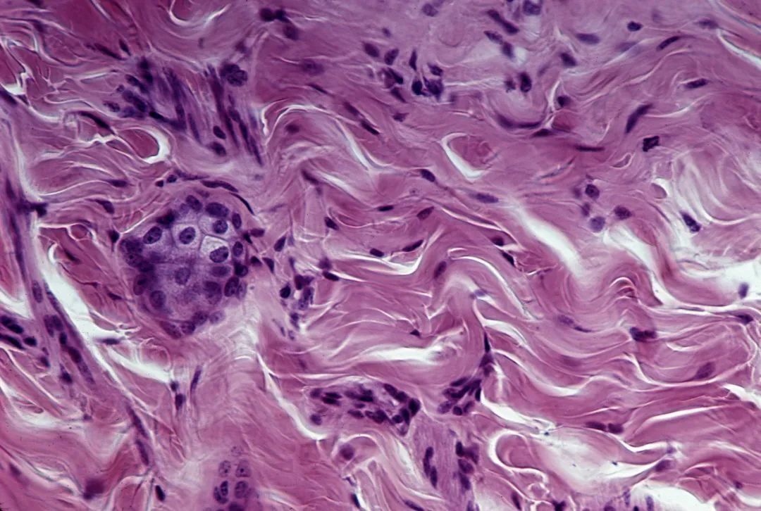 皮肤真皮层的纤维细胞核(紫色点)在显微镜下纤维性结缔组织中的呈现。