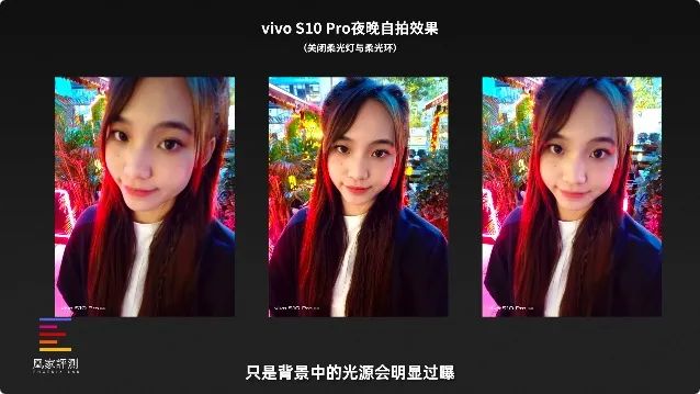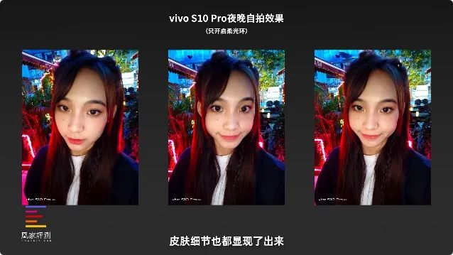 晚上拍照sensor再强,没有灯光也只会不知所措,这方面,vivo S10 Pro也继承了上一代的补光策略,屏幕中的柔光环,以及边框处的柔光灯也都包含其中。