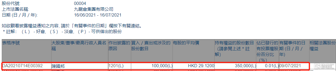格隆汇APP获悉,根据联交所最新权益披露资料显示,2021年7月9日,九龙仓集团(00004.HK)遭董事陈国邦在场内以每股均价29.12港元减持10万股,涉资约291.2万港元。