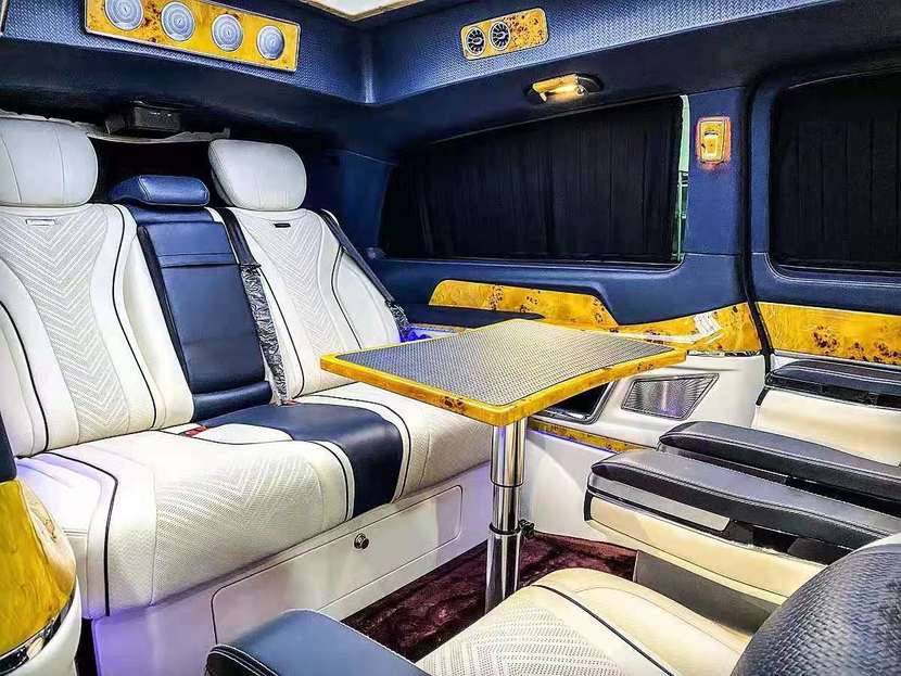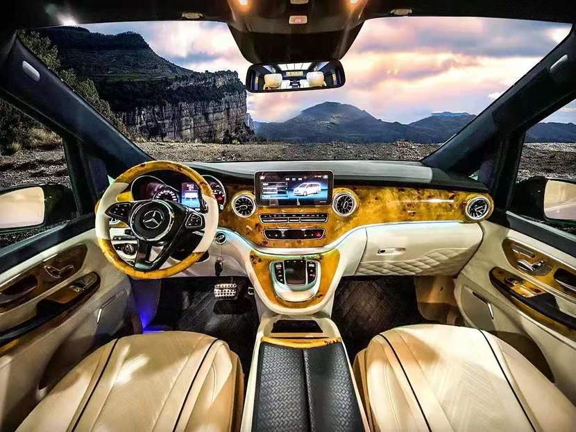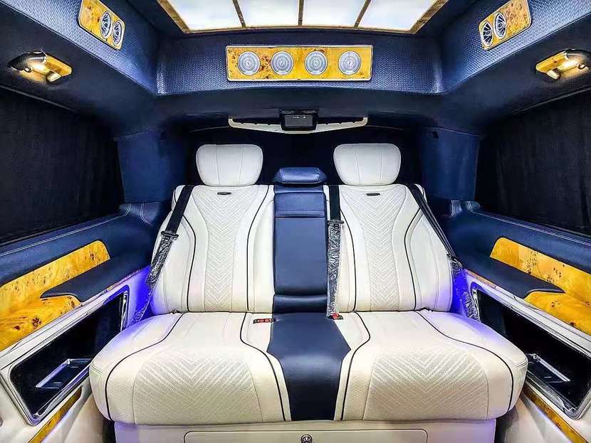 奔驰V260L星际版,车载装饰轻奢有质感。3块定制钟表,显示温度、湿度、时间。可个性化定制壁灯,熠熠生辉。柏林之声音响系统、定制水晶萤石星空顶、豪华纪念地毯 、BV设计元素及内饰装饰侧壁,整体而言,现代又不失奢华质感。俄罗斯进口窗帘出风口。如您对奔驰V260L星际版感兴趣,可私信我获取更多细节参数和图片。