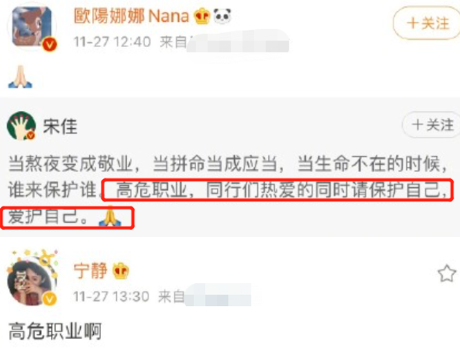 此前,小宋佳、宁静和欧阳娜娜等艺人纷纷在社交平台上发文称演员是高危职业,引起了不少网友的热议。