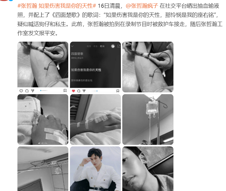 但又是输液图又是抽血照,大家能够感受出来张哲瀚应该身体状况并不算好。
