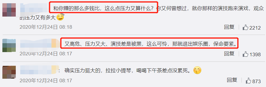 当时不少网友一致认为这些艺人在社交平台上发布这种资讯的行为不合适,甚至表示他们拿着天价薪酬拍戏,如果还要喊累那不如趁早退出娱乐圈,保命要紧。
