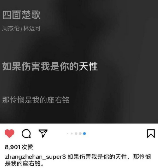 在文字中,张哲瀚选取了一句《四面楚歌》的歌词,引发了不少网友们的讨论。