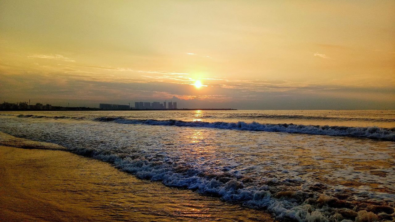 漫步欣赏山海相连的海滨美景和日落霞光