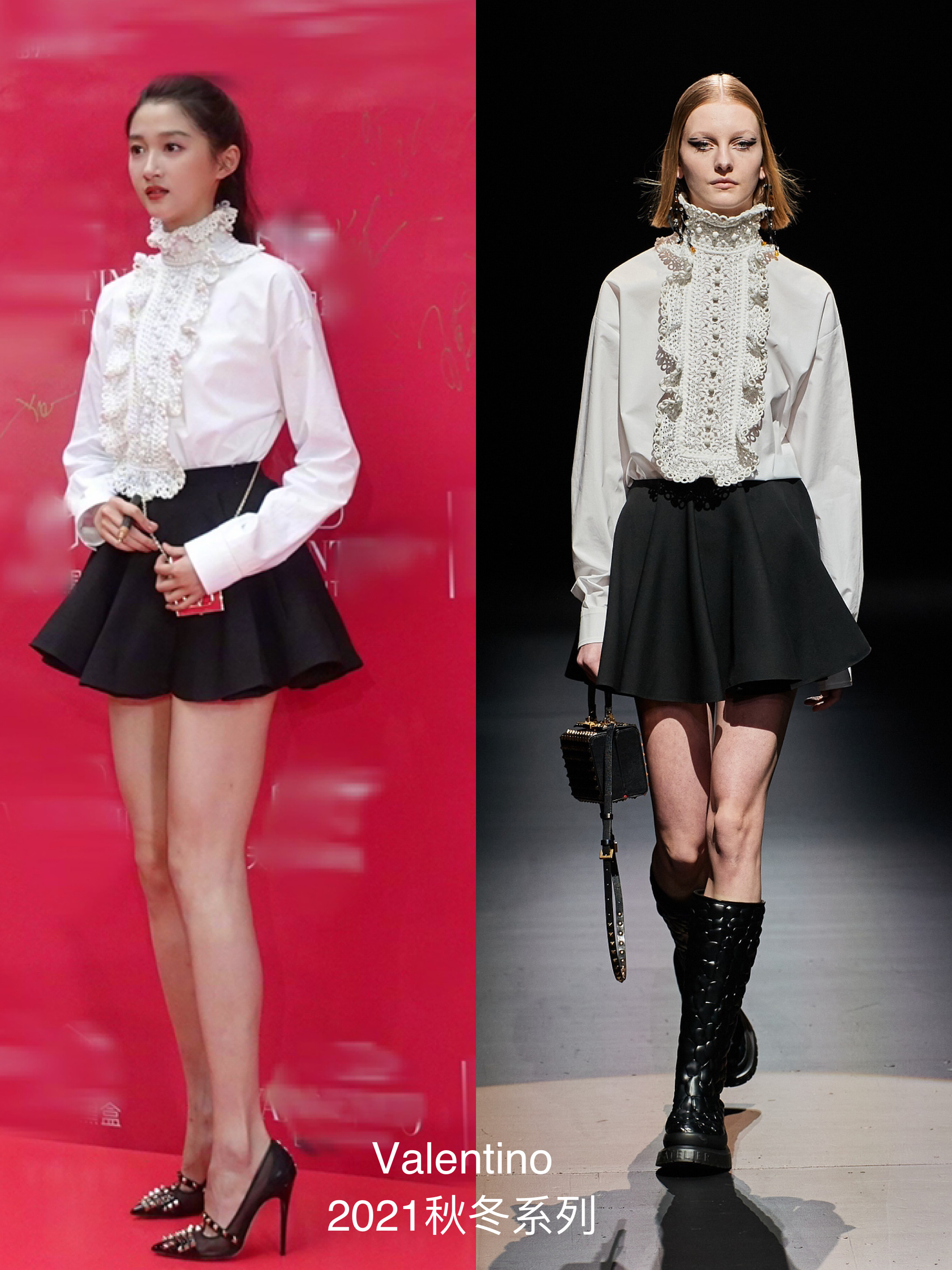 这套活动造型就是一个例子,复古的高领宫廷风泡泡袖衬衫搭配高腰小短裙,这套look风格比较年轻,挺适合关晓彤的,花瓣高领强调她的小头小脸,高腰短裙也能强调她细长直的美腿,非常不错吧?