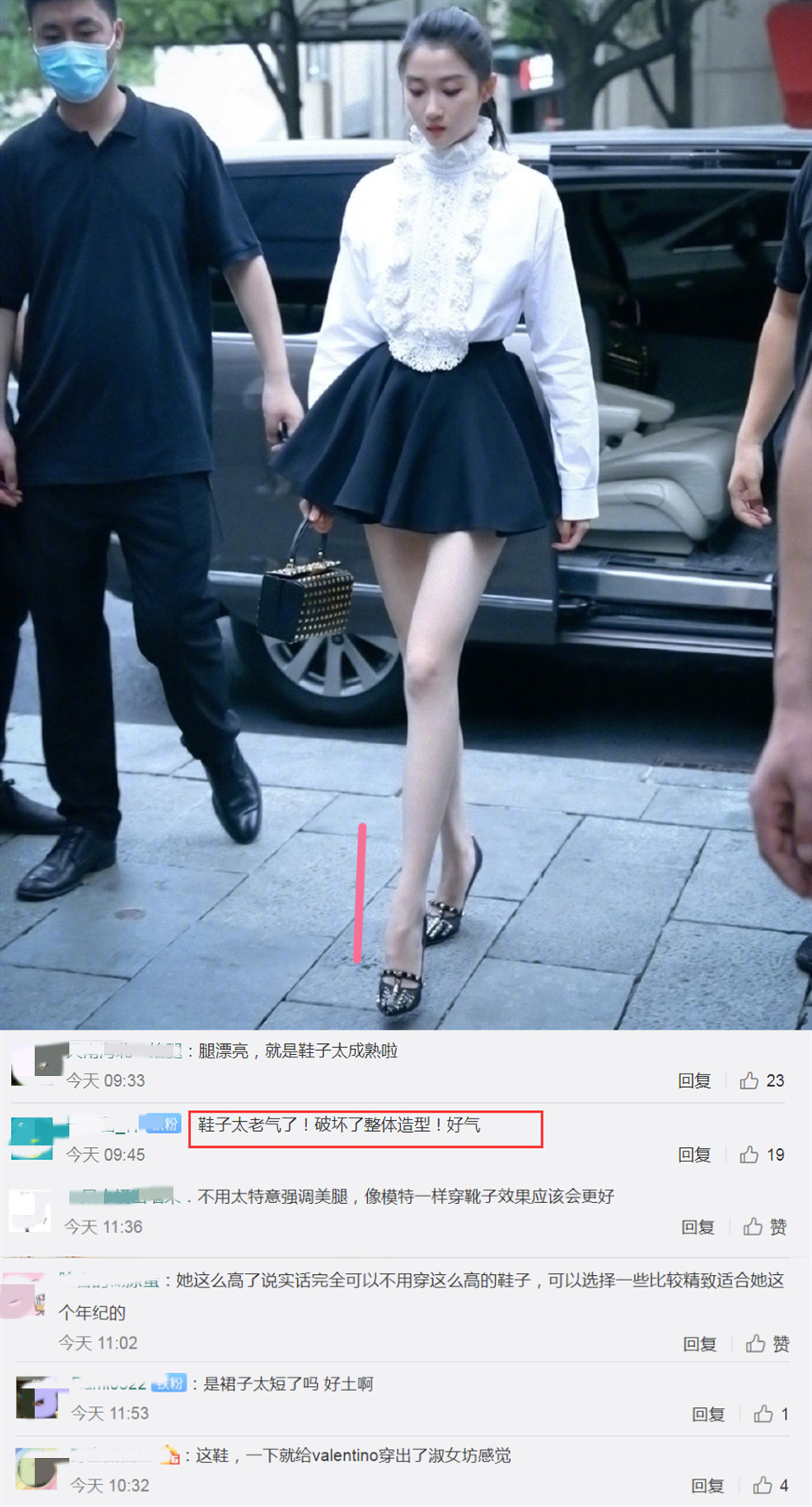 但弄巧成拙,这双超高跟不仅累脚,也如吃瓜群众所言,将这一套look秒变成淑女屋的土气风格,甚至还增添了几分老气感,生生地用一双鞋毁掉了一整套造型的时尚感。