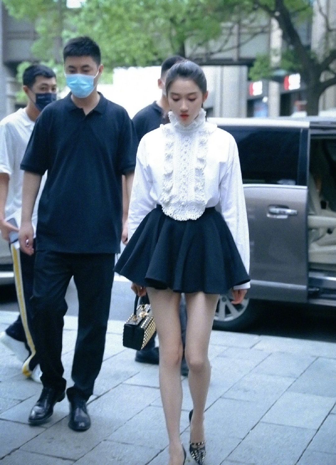 因为腿非常优秀,细长直,那么自然可以多尝试一些高难度的,腿短星族不能尝试的风格来突出自己的优势,比如这套西装裙,关晓彤的条件也完全可以和模特一样选择绑带鞋来穿,穿黑丝+浅口高跟鞋,同样也很容易穿成房产销售。