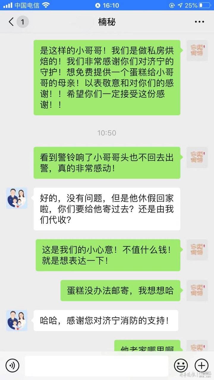 “16日中午我们加班制作了一些月饼和常温糕点,下午按地址给他寄了过去,我们也把这个情况转告了苏女士。”对于这场从广西柳州到山东济宁的爱心传递,翟君觉得没什么值得多说的,“这几年我们看到很多消防战士让人难忘的身影,他们普遍很年轻,却为了人民群众的安全总是冲在最前面,所以用这种方式表表心意,真的不算什么。”