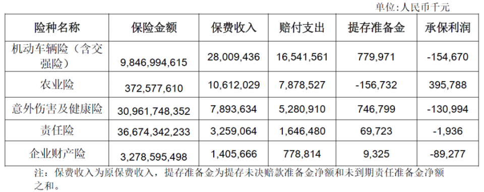 需要提及的是,保费收入居前五的商业保险险种机动车辆险(含交强险)、农业险、意外伤害及健康险、责任险、企业财产险,只有农业险承保利润盈利,其余皆为亏损。