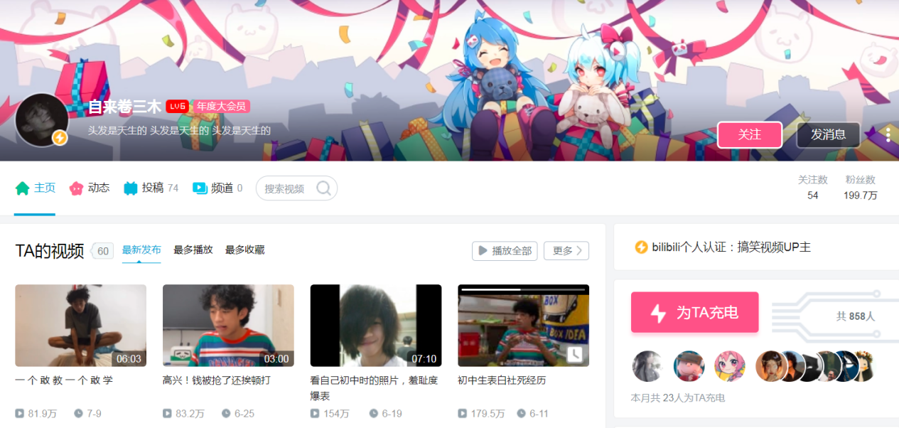 作为B站涨粉最快的搞笑UP主之一,@自来卷三木 视频内容灵感大多来自生活中那些不被放大的日常,通过神还原当代年轻人内心戏,戳中网友笑点,加以极具川普特色的口音与卷发造型,获得了B站网友的喜爱,同时独创并带起了“你真棒”、“乂”等b站流行梗的传播,极具个人辨识度。账号运营两月内涨粉破百万,截止目前已有199万粉丝。