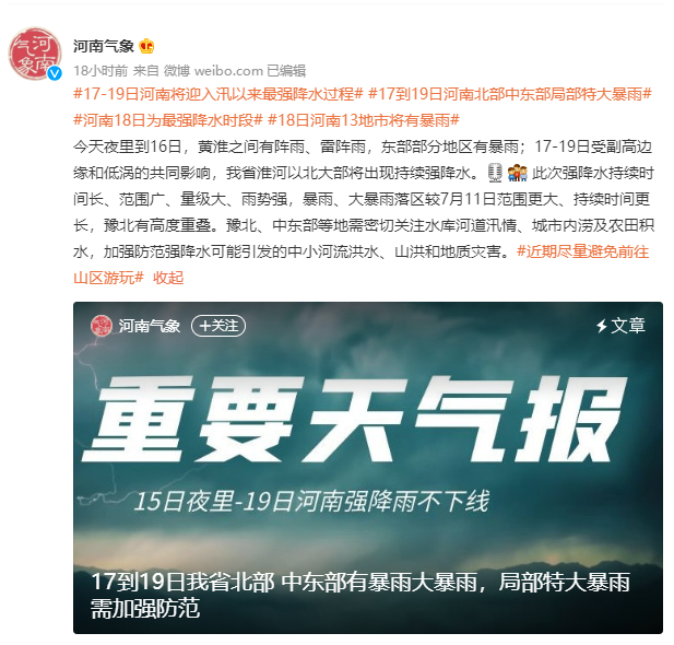 17日-19日河南将迎入汛以来最强降水过程