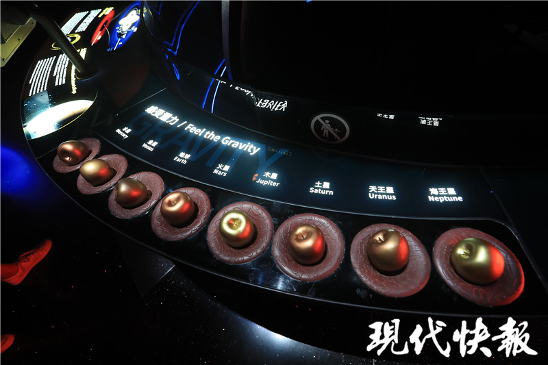 家园展区,金星、木星、土星、火星……有个桌子上并排放了8个看起来一模一样的苹果,拿起来掂量掂量,每个苹果的重量却不同,有的轻得好像空心,有的重得像铁球。“每一个苹果,都代表了太阳系的一个行星。你可以通过掂量苹果的重量,来感受八大行星的重力加速度。”上海天文馆专家介绍。