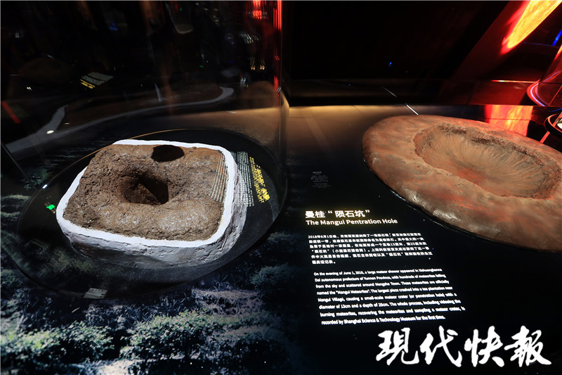 除了陨石,现场还展出了陨石坑。2018年6月1日晚,云南西双版纳降了一场陨石雨,数百块陨石散落在勐遮镇一带,这些陨石后来被国际命名为“曼桂”陨石。其中最大的一块坠落在曼桂村一茶园里,在地面形成了一个直径13厘米,深25厘米的“陨石坑”(小型陨石撞击洞)。这次展览,曼桂陨石坑也是网红展品之一,备受关注。3年前,由于天气等原因,陨石猎人张勃带着曼桂陨石曾在南京逗留了两天多。