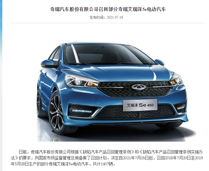 具体来看,奇瑞汽车决定自2021年7月16日起,召回2018年7月20日至2019年5月28日生产的部分奇瑞艾瑞泽5e电动汽车,共计1407辆。这些车辆所搭载动力电池内部分零件装配可能存在一致性波动。车辆经过长期使用,车辆底部受到异常撞击或经受剧烈颠簸冲击后,极端情况下可能导致电池包系统高压连接松动,局部接触内阻增高,大电流使用时造成组件过热并烘烤电芯,从而可能引起电池热失控,存在安全隐患。