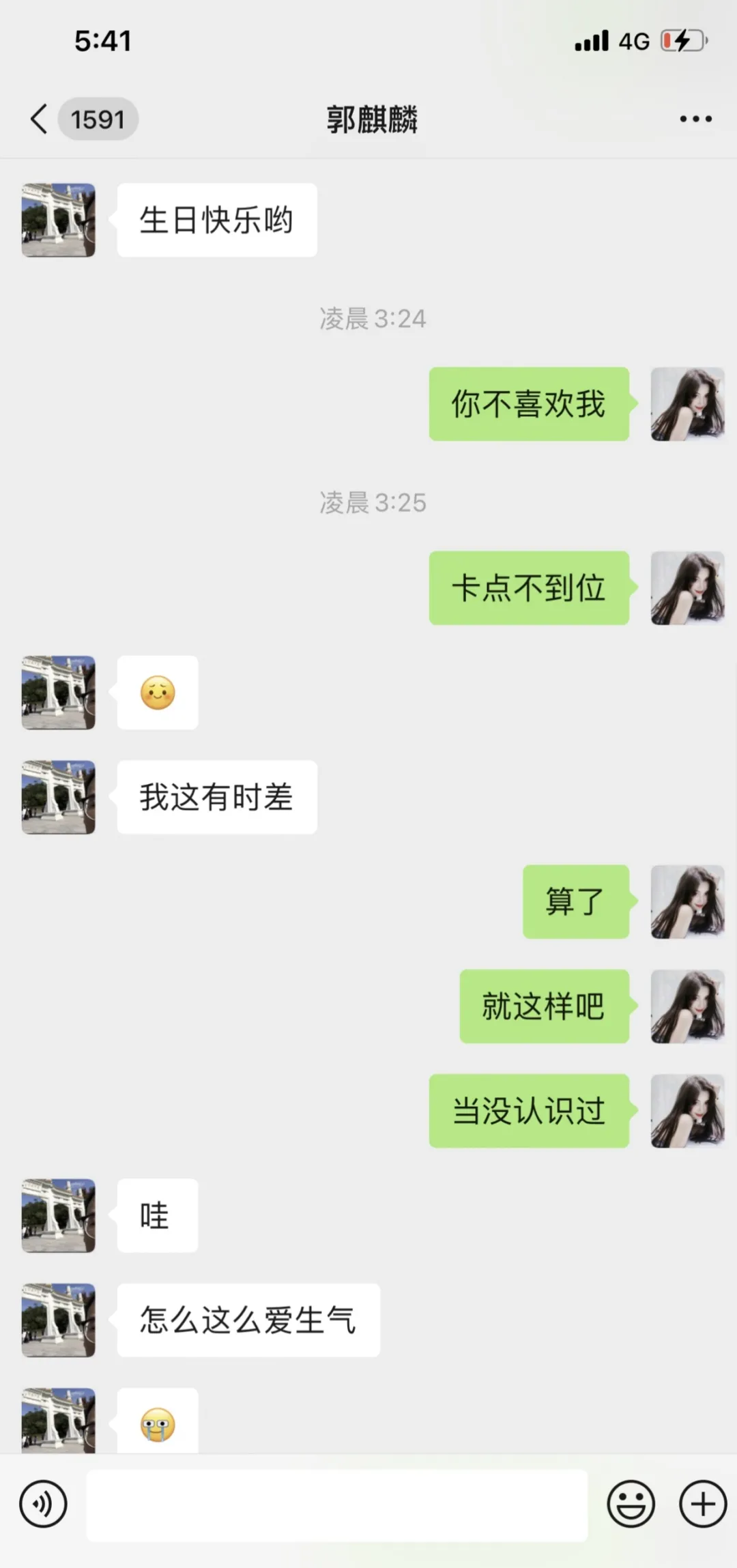 “安珀wang”与郭麒麟闹掰了的原因很有意思,在“安珀wang”放出的最后一张截图中,我们清楚地看到,这个姐姐非常不满意郭麒麟给她的生日祝福没卡上点。