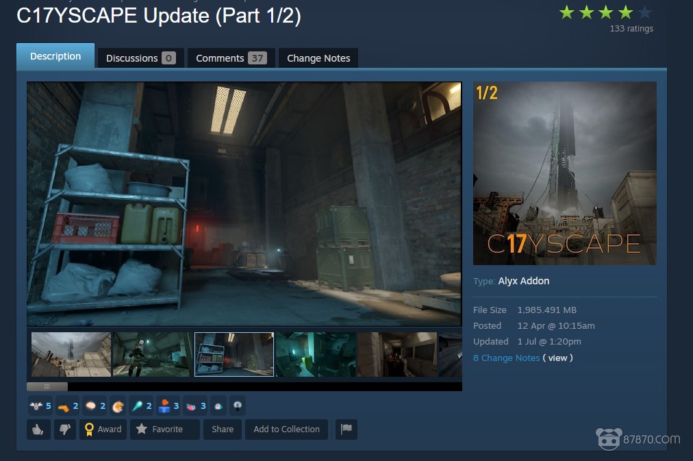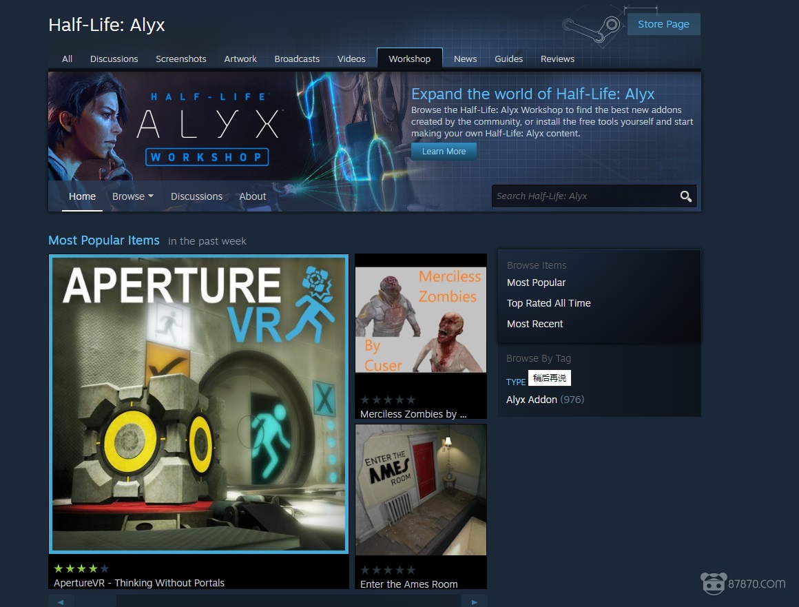对MOD如此看重的Valve在制作Steam游戏平台之后也没有放弃这个良好的传统,在游戏中添加了“创意工坊”的选项,众多游戏都有着非常丰富的MOD,包括今天的主角《半衰期:爱莉克斯》,在其工坊页面现在拥有33页,共976个创意MOD,《生化奇兵》只是其中一个。