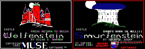 目前是公认PC游戏史上最早的有名全面修改型Mod,起源在上个世纪80年代。在1981年一个名为Muse的工作室为当时如日中天的PC电脑Apple II做了一款叫做《德军总部》(Wolfenstein)的潜入型游戏,在两年后有三个高中生专门给他做了款“蓝精灵总部”的MOD,将德军纳粹改成了一群可爱的蓝精灵。