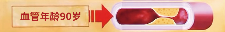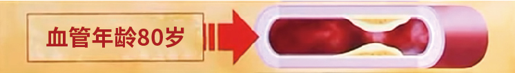当血管年龄在80岁时,血管的斑块变大,对血管的管腔开始产生较大影响,这时候远端器官的供血就会降低。与60岁的血管相比,粘稠物状变得更大,附着于血管两侧,使得血管内径变得更小。