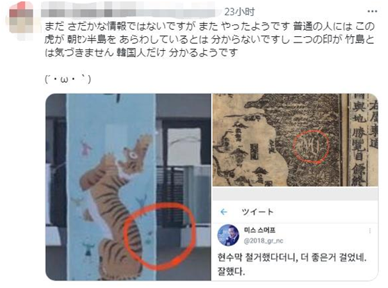 “目前还没有完全确定,但(韩国代表团)好像又在搞事。一般的(日本)人看不出来这只老虎与朝鲜半岛的形状相似,图上画圈的点是在象征着‘竹岛(独岛在在日本的称呼)’。好像只有韩国人能看出来。”