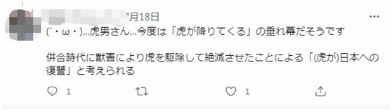 同时,还有日本网友认为,图中老虎的形状与朝鲜半岛的形状相似,而在老虎旁边的点状,与老虎的相对位置似乎象征着日韩争议岛屿“独岛”。↓