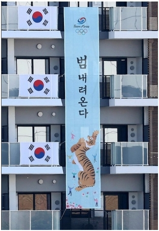 据韩国《朝鲜日报》19日报道,韩国代表团在东京奥运村中最新悬挂的“猛虎图”标语上写着的“老虎来了”为朝鲜族的传统说唱音乐“盘索里”中的一节,去年“老虎来了”的翻唱版本在网络上曾掀起热潮。