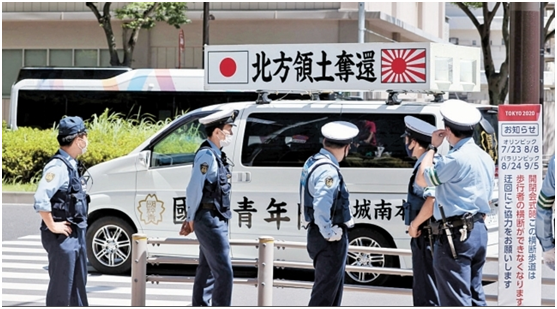 综合《中央日报》、《朝鲜日报》等韩媒19日报道,日本右翼团体“国粹青年队”近期在奥运村周边进行“对韩国人具有侮辱性质”的示威游行活动,其使用的车辆上就张贴着旭日旗。