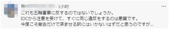 有日本网友称,“这张图是不是也违反了奥林匹克宪章?明明刚收到国际奥委会(IOC)的警告,却马上重蹈覆辙,性质恶劣。我认为这回不会让(韩方)撤下该图就能了事。”↓