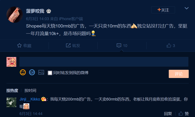 事实上,Shopee梭哈南美洲的战略,与其当前日益高企的流量成本有着直接关系。有商家曾在微博吐槽,“Shopee每天烧100RMB的广告,一天只卖10RMB的东西,独立站没打过广告,坚挺一年月流量10k+,是市场问题吗?”事实上,这并非个例,评论区某网友也谈到,“我每天烧200RMB的广告,一天卖60RMB的东西,老板让我月底收拾收拾滚蛋,你呢?”