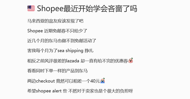 不过,在这个方面,狂飙突进的Shopee做得并不够好,甚至可以说是怨声载道。近年来,有不少用户在小红书上吐槽,“Shopee购物,越来越让人心累”、“虾皮在赶走顾客?Shopee我不爱你了”、“Shopee最近开始学会吝啬了吗”……这些怨言背后一个重要的原因是,Shopee给用户的优惠越来越少,不光彩的手段越来越多。