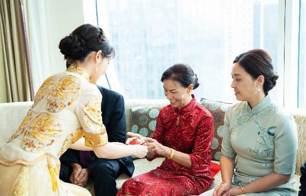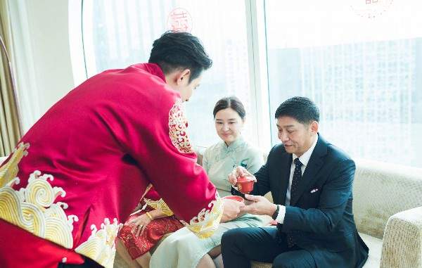 除了唯美的婚纱,两人敬茶的时候换上了传统旗袍,