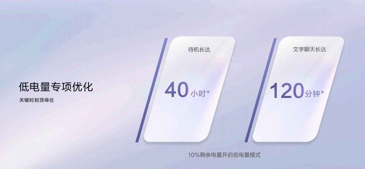 麦芒10 SE 5G在低电量模式下,能够智能识别和关闭非用户预留、非核心应用和耗电进程。当电量仅剩10%时,该模式可以支持手机文字聊天2小时,最长待机40小时。所以,即使出门在外突然发现没电,也不用过于担心。