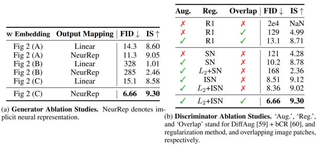 表 3:在 CIFAR-10 数据集上对 ViTGAN 执行的控制变量研究。左图:对生成器架构的控制变量研究。右图:对判别器架构的控制变量研究。
