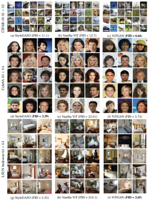 图 3:定性比较。在 CIFAR-10 32 × 32、CelebA 64 × 64 和 LSUN Bedroom 64 × 64 数据集上,ViTGAN 与 StyleGAN2、Transformer 最佳基准、纯净版生成器和判别器的 ViT 的结果比较。