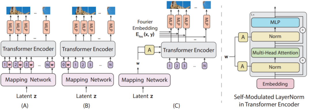 图 2:生成器架构。左图是研究者研究过的三种生成器架构:(A) 为每个位置嵌入添加中间隐藏嵌入 w,(B) 将 w 预置到序列上,(C) 使用由 w 学习到的仿射变换(图中的 A)计算出的自调制型层范数(SLN/self-modulated layernorm)替换归一化。右图是用在 Transformer 模块中的自调制运算的细节。