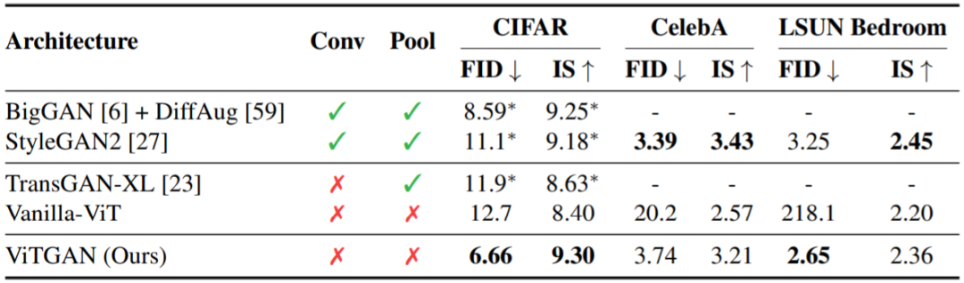为了更具说服力,研究者在三个标准的图像合成基准上进行了实验。结果表明,新提出的模型 ViTGAN 极大优于之前的基于 Transformer 的 GAN 模型,并且在没有使用卷积和池化时也取得了与 StyleGAN2 等领先的基于 CNN 的 GAN 相媲美的表现。作者表示,新提出的 ViTGAN 算得上是在 GAN 中使用视觉 Transformer 的最早尝试之一,更重要的是,这项研究首次表明 Transformer 能在 CIFAR、CelebA 和 LSUN 卧室数据集等标准图像生成基准上超过当前最佳的卷积架构。